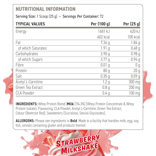 Whey Protein Blend (Milk) (94%) (Whey Protein Concentrate & Whey Protein Isolate), Flavouring, CLA Powder, Acetyl L-Carnitine, Green Tea Extract, Sweeteners (Sucralose, Steviol Glycosides), Colour (Turmeric Extract).
