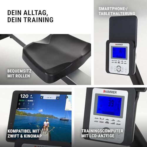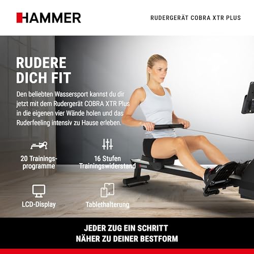 HAMMER Rudergerät Cobra XTR Plus II für zu Hause â Rudermaschine mit innovativem Trainingscomputer, Smartphone-/Tablethalterung, bis 130 kg Nutzergewicht, 232 x 55 x 75 cm, Schwarz, 4532
