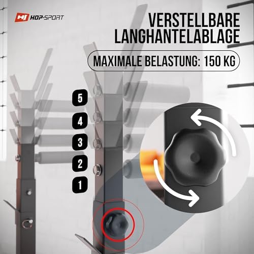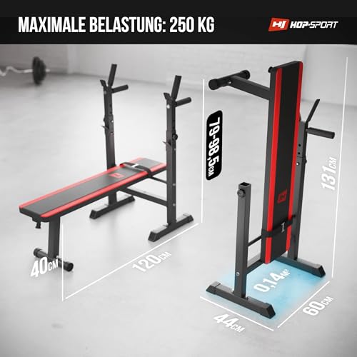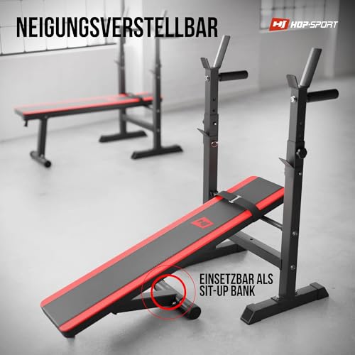 Hop-Sport Hantelbank Klappbar, Multifunktional Trainingsbank mit Langhantel-Ablage und Dip Station, Ideal für Bauchtrainer, Krafttraining & Fitness Zuhause – Max. Belastbarkeit 250 kg