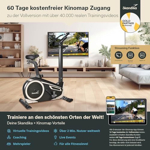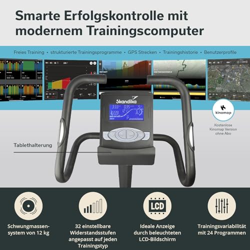 Skandika Ergometer Morpheus | Heimtrainer für Zuhause, 12 kg Schwungmassensystem, 32 Levels, 24 Programme, App Kompatibel mit Kinomap, Pulsgurt, Tablethalterung | Indoor Fahrrad bis 150 kg